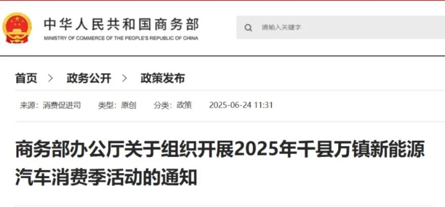为深入贯彻落实党中央、国务院关于大力提振消费的决策部署,持续释放新能源汽车消费潜力,加快培育汽车消费新增长点,按照“购在中国”系列活动安排,商务部将组织开展2025年千县万镇新能源汽车消费季活动。现将有关事项通知如下: