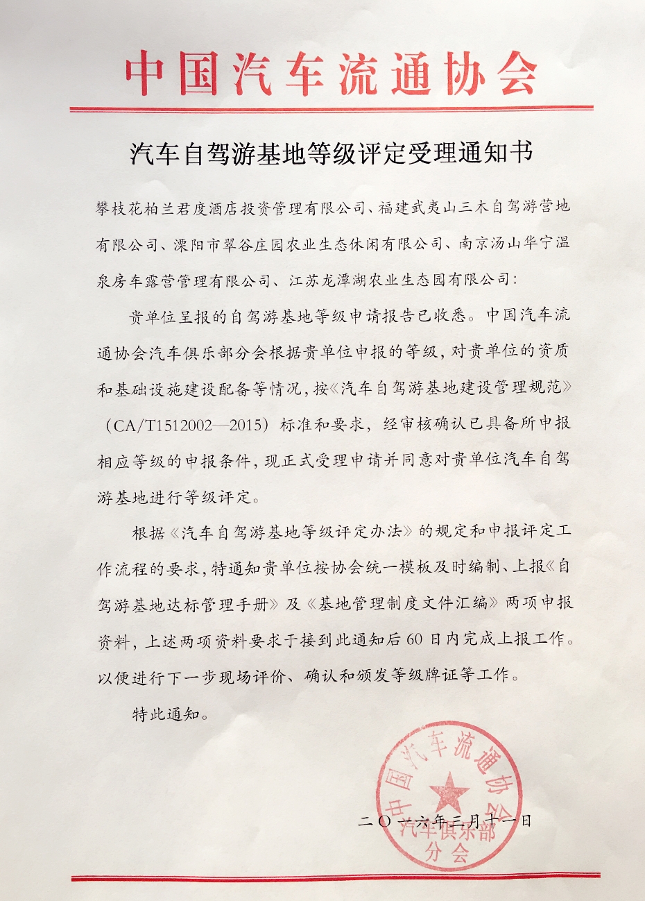 第二批“汽车自驾游基地等级评定”申请单位的受理通知