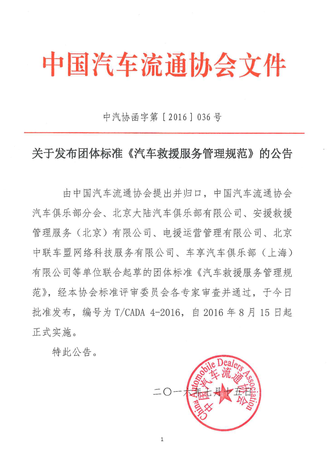 关于发布团体标准《汽车救援服务管理规范》的公告